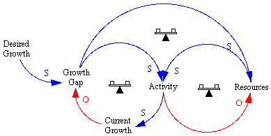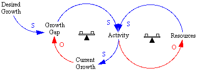 Desired Growth interacts with Current Growth to create a Growth Gap. This gap influences additional Activity. This Activity serves to increase Current Growth which subsequently influences the Growth Gap to decline.