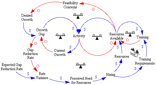 Along with the Desired Growth there is an Expected Gap Reduction Rate which interacts with the actual Gap Reduction Rate to create a Rate Variance. It is this Rate Variance which influences the Perceived Need for Resources. As the Perceived Need for Resources increases it results in Hiring. Hiring increases Resources and at the same time increases Training Requirements. The Training Requirements result in Training, yet the Training decreases the Resources Available.