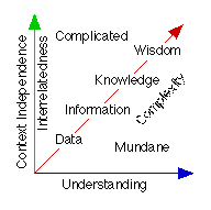 The idea being that as the degree of interrelatedness of the statements increases the object they define becomes more and more context independent. The intent is to create objects which have as high a degree of interrelatedness and context independence as possible, while providing as substantial a foundation for understanding as possible. These objects would then reside somewhere on the continuum from data to wisdom. An object with a high degree of interrelatedness that doesn't provide understanding would be viewed as complicated. An object that provided a high degree of understanding with very little interrelatedness and very context dependent would be mundane.