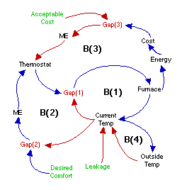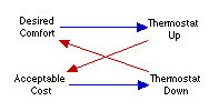 My desired comfort interacts with the current temperature producing a gap. This gap influences me to increase the thermostat, influencing the furnace which influences the current temperature, thus reducing the gap. Desired comfort is an element of some other subsystem not considered here.