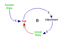 In the balancing loop the difference between the desired state and the actual state produces a gap. This gap influences adjustment changing the actual state in the direction of the desired state, making the gap smaller. This continues until the adjustment changes the actual state to the desired state and the gap is reduced to zero. Balancing loops seek equilibrium.